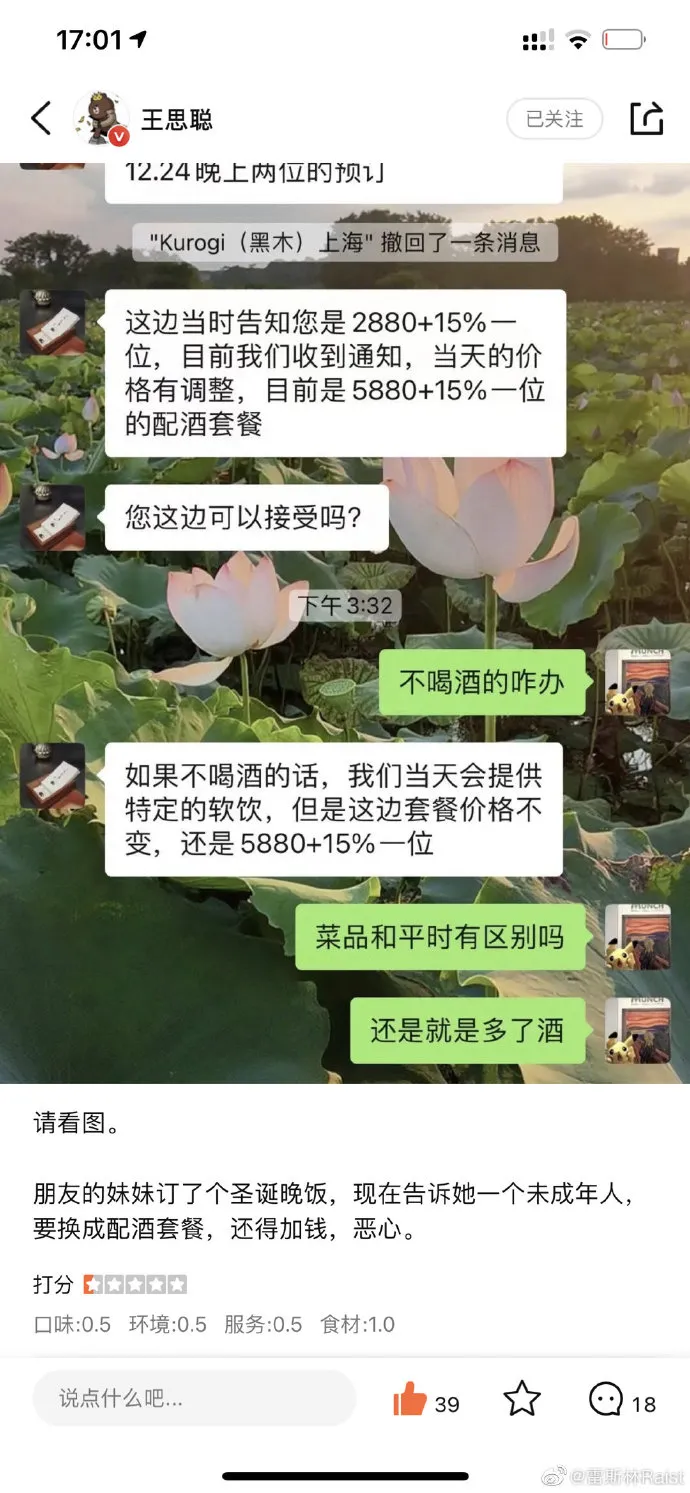 前段時間,王思聰發了條大眾點評爆料,説他朋友的妹妹定了黑木的聖誕套餐,本來説好價格3312元,現在突然要變成6762元的含配酒套餐。