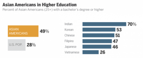 下面這篇新聞中就説了美國的亞裔中51%的人接受過高等教育,擁有大學學歷: