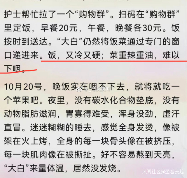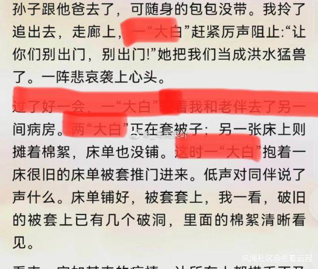 上海石頭去內蒙旅遊感染新冠,之後在蘭州確診並接受治療。她在文中吐槽了最早接收她治療的蘭州肺科醫院,“等了足足兩個小時才放行 ‘’病房裏冰冷冷的兩張牀,牀架子佈滿灰塵 、一大白趕緊厲聲阻止,“讓你們別出門”,她把我們當成洪水猛獸了 、 破舊的被套上已有幾個破洞 、 有人敲窗“戴好口罩”、 大白讓我自己擦牀頭櫃,要求我拖地板,拖完已經氣喘吁吁,大汗淋漓 飯又冷又硬、菜重辣重油,難以下嚥”等等,不一而足。