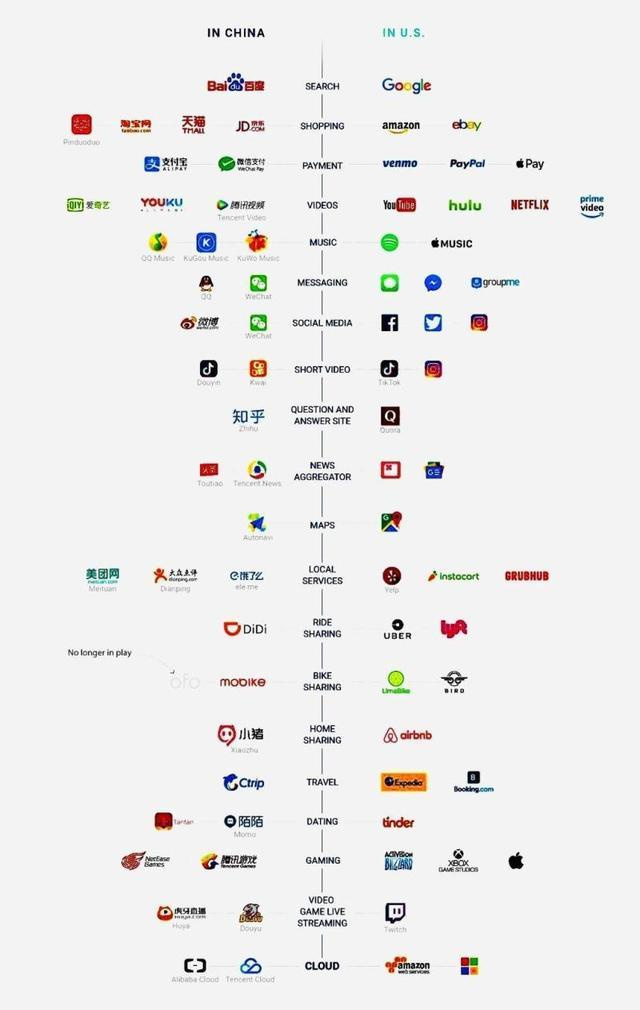 1. 圖為中美互聯網科技公司陣營。中國公司看上去陣容強大,確實和美國有一拼,其它國家都差遠了。直到2020年,巨頭市值是美國的四大領先(蘋果微軟亞馬遜谷歌),中國也有騰訊阿里兩個大的,千億美元的也好幾個。