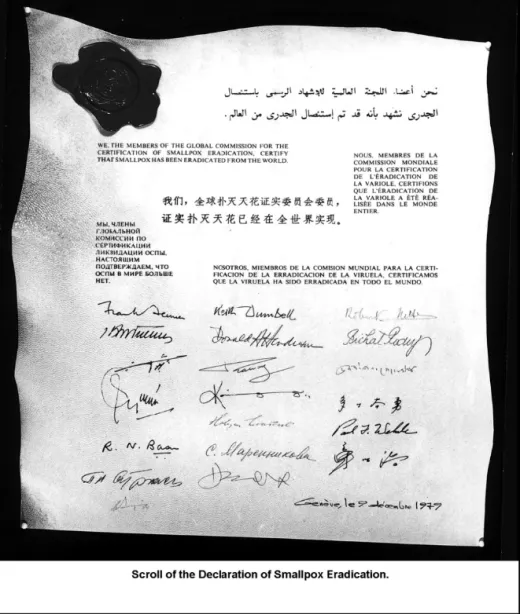 1979年12月9日,瑞士日內瓦,WHO專家組鄭重地在承載着《根除天花宣言》的羊皮紙上簽字,並蓋上紅色蠟印。
