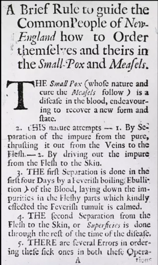 美國第一本關於天花的小冊子是托馬斯·撒切爾醫生(Thomas Thacher)編寫的《新英格蘭公眾處置天花或麻疹指南》(A Brief Rule to Guide the Common People of New England how to order themselves and theirs in the Small Pocks, or Measels)。
