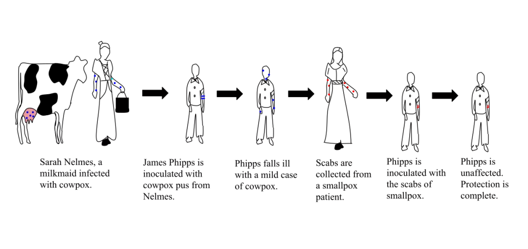 1796年5月14日,積累了豐富行醫經驗的詹納給8歲的菲普斯(James Phipps)接種了牛痘,痘苗取自一位擠奶女工。菲普斯出現局部反應,幾天後就完全恢復了。為了檢驗牛痘的保護作用,同年7月,他為菲普斯接種了取自人類天花瘡的物質,結果是成功的。