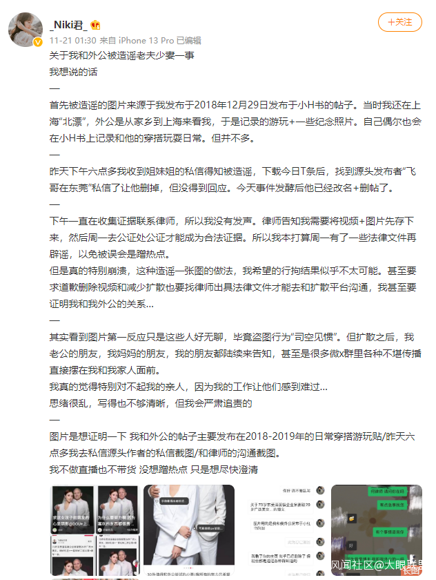 11月21日凌晨,名為_Niki君_ 的博主刊出長文,回應被造謠“老夫少妻”一事。