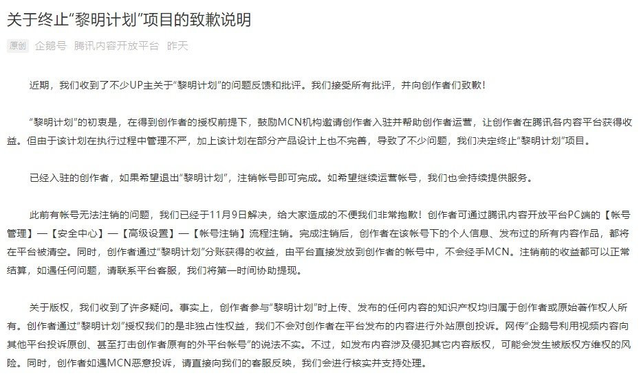 2021年11月17日,騰訊內容開放平台發佈致歉公告,並宣佈終止企鵝號“黎明計劃”項目。