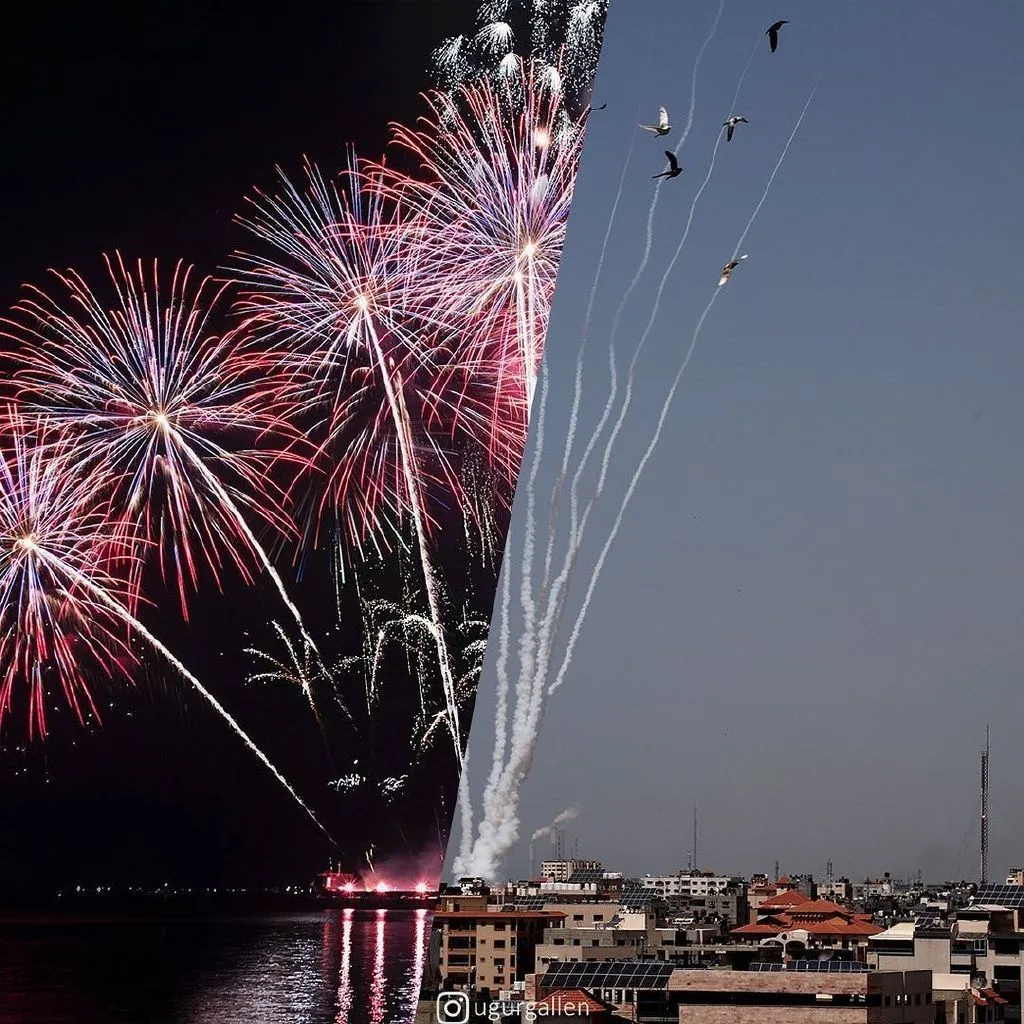 同一片天空下,一邊是絢麗的盛放煙花,一邊是炮火的殘酷襲擊。
