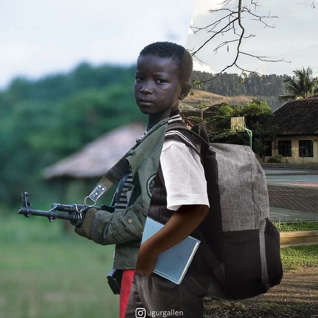 同樣的年齡,一邊拿着機槍目光空洞,一邊揹着書包汲取知識的營養;