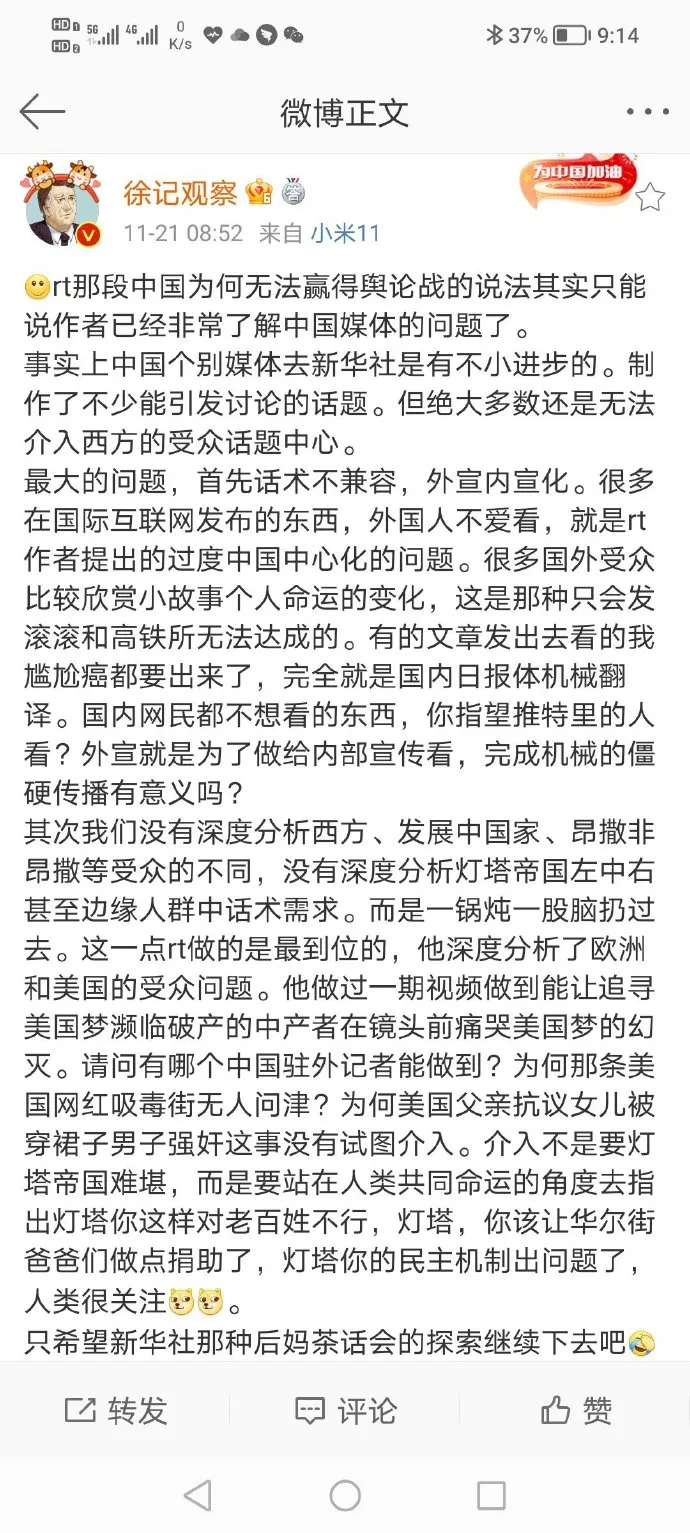 六月份寫了兩篇關於外宣工作的文章《我國對外輿論宣傳中亟待補充的一個元素》和《再談外宣工作中的問題》,看到微博網友@徐記觀察 提出的外宣工作中存在的一些問題現象(原文鏈接:https://weibo.com/1895859130/L2tjTAkls),今天再就這個話題談一下。