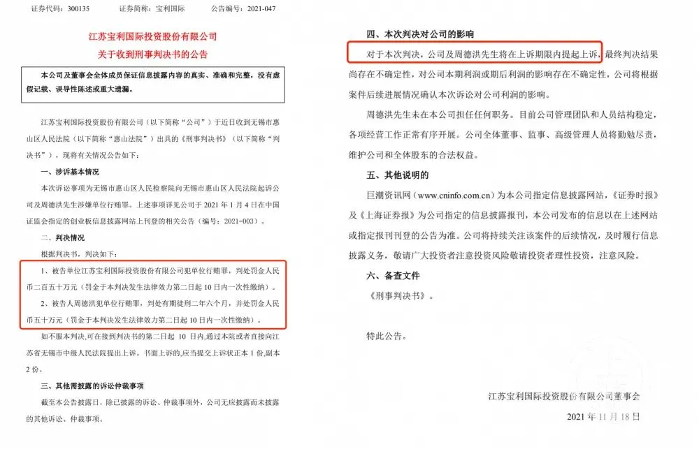 因犯單位行賄罪,江蘇寶利國際投資股份有限公司被判處罰款250萬元,前董事長周德洪犯單位行賄罪被判處有期徒刑2年6個月。