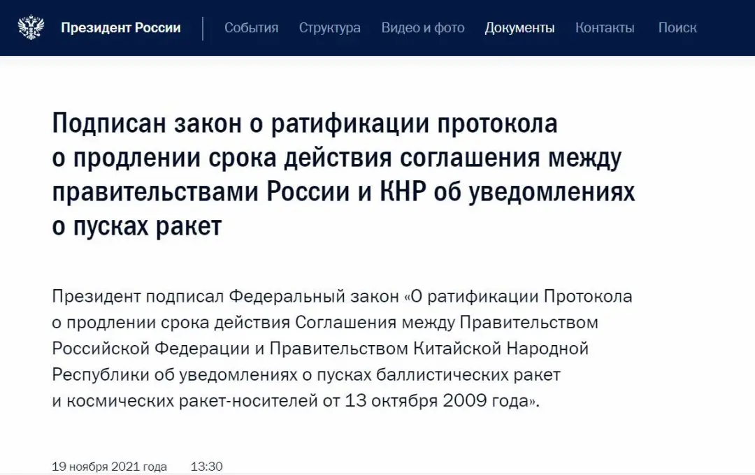 克里姆林宮網站當地時間19日發佈消息稱,俄羅斯總統普京簽署了聯邦法律,批准《關於延長2009年10月13日〈中華人民共和國政府與俄羅斯聯邦政府關於相互通報發射彈道導彈和航天運載火箭的協定〉有效期的議定書》。