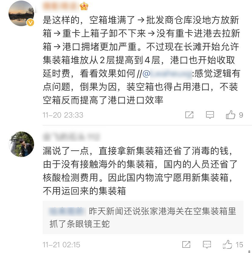 5、大家的選擇很簡單——回程不裝箱。這樣可以在美國港口節省5天的裝空箱時間,在中國港口又可以節省2天的卸空箱時間,裏外裏相當於一趟光租金就節省了大約200萬美元,而且運營效率還提升了超過10%。中國這邊缺空箱也不要緊。各大航運公司正開足馬力造空箱,據説某大型航運公司現在單月就能造20萬個集裝箱,成本也不高。