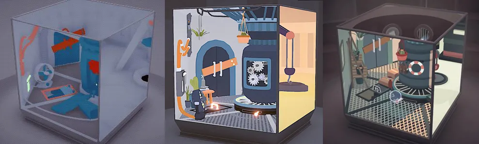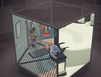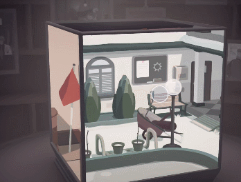 盒子的每個面都是通往一個獨立空間的窗口,找到這些世界裏相似的物品,轉動視角靠着“視錯覺”將本無關聯的它們拼接起來解開謎題,就是這款遊戲的核心玩法。