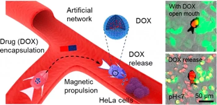 實驗中,魚形機器人有一個可調節的嘴,可以隨着pH值高低打開和關閉。該形狀也被發現可通過模擬血管轉向,以達到培養皿中特定區域的癌細胞。為了使微型機器人具有磁性,它們還被放置在氧化鐵納米粒子的懸浮液中**,後續可使用磁鐵直接引導向癌症細胞****。**