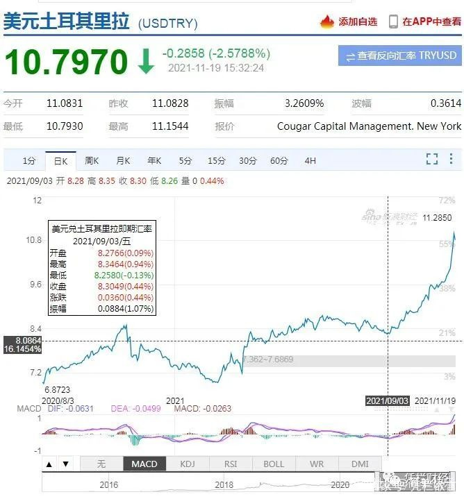 11月19日,土耳其央行宣佈降息100基點,隨後土耳其里拉兑美元匯率跌破11。
