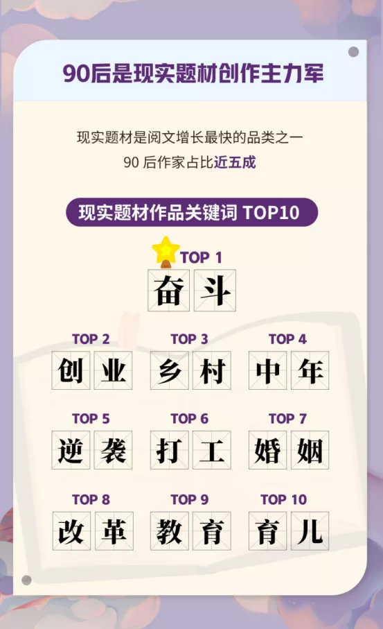 根據最新統計,現實題材是閲文增長最快的品類之一。其中,最受關注的關鍵詞非奮鬥莫屬。