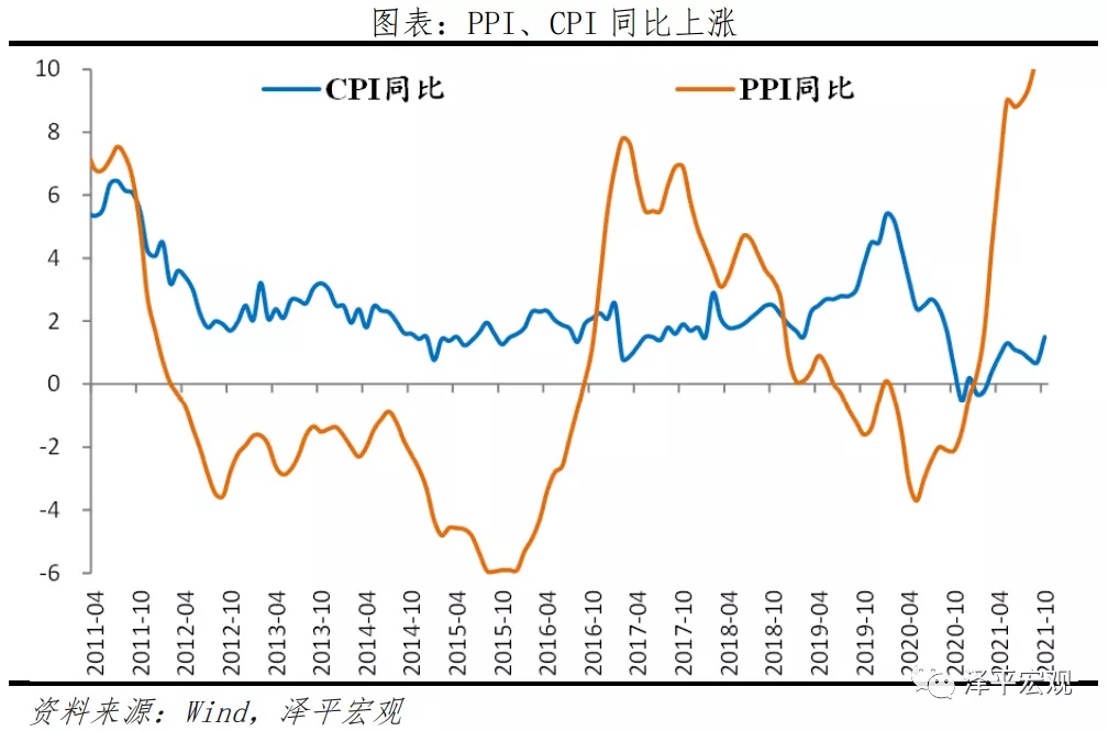 **10****月PPI同比上漲13.5%,漲幅比上月擴大2.8個百分點;環比上漲2.5%,漲幅比上月擴大1.3個百分點。**具體來看,煤炭開採和洗選業價格同比漲103.7%,環比漲20.1%;石油煤炭及其他燃料加工業價格同比漲53%,環比漲7.3%;化學原料和化學制品製造業同比漲31.5%,環比漲6.1%。黑色金屬礦採選業環比延續下跌,10月環比跌幅為8.9%。10月CPI底部回升,但PPI-CPI剪刀差仍繼續走擴,下游企業利潤持續受到擠壓。