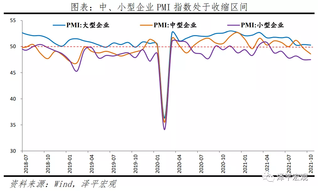 **10****月大、中、小型企業PMI分別為50.3%、48.6%和47.5%,較上月變動-0.1、-1.1和0.0個百分點。中、小型企業持續收縮,經營壓力仍在。**中、小型企業新訂單指數分別為47.7%和46.1%,較上月變動-1.1和-0.2個百分點;新出口訂單分別為47.1%、41.3%,加速收縮;小型企業經營預期為49.4%,再次落入收縮區間。行業成本壓力仍擠壓下游企業,尤其是小型企業利潤,10月小型企業採購量指數為46.8%,較上月下滑1.6個百分點,連續六個月位於榮枯線下。