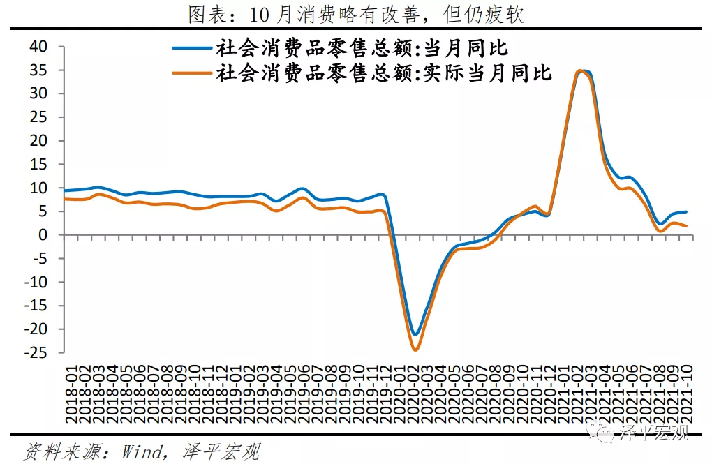 **10****月社會消費品零售總額兩年複合增長4.6%,較上月加快0.8個百分點;扣除價格因素,實際兩年複合同比3.2%,較上月上升0.8個百分點。消費和疫情變化負相關性較強;**10月新增本土病例493例,較8、9月份有所緩解。其中,按消費類型分,10月份,商品零售同比增長5.2%,較上月上升0.7個百分點;餐飲收入增長2.0%,較上月下降1.1個百分點。