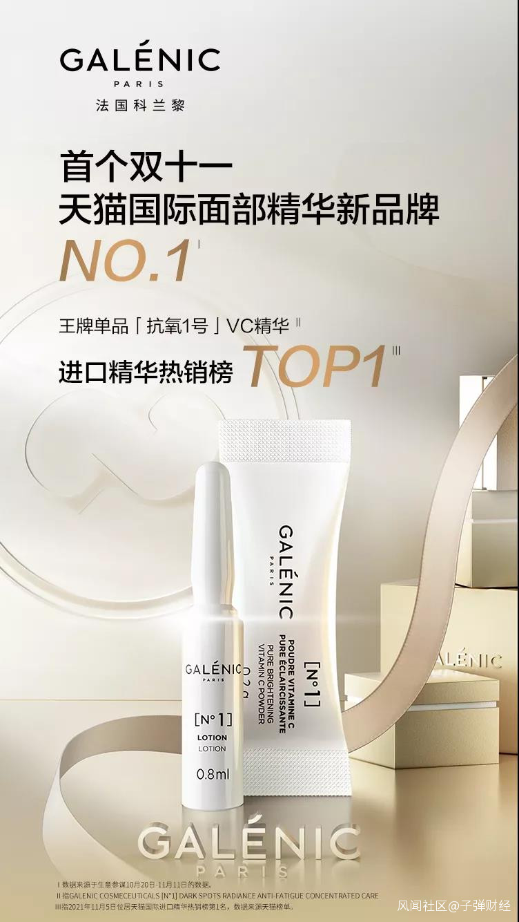 正因此,Galenic這個法國護膚品牌在加入逸仙電商後銷量實現了快速增長,2021年雙十一期間,其明星單品「抗氧1號」VC精華開售35分鐘超618總銷售額,躍居進口精華回購榜Top 1。