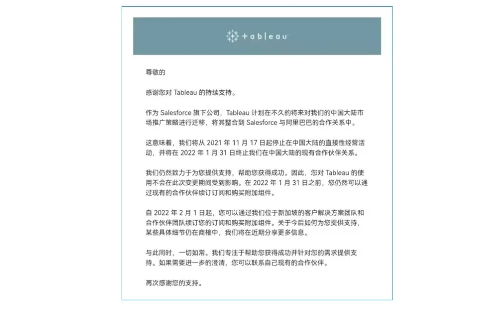 一個普通的星期三,Tableau公司突然於2021年11月17日,宣佈停止中國的直接銷售,轉而整合進Salesforce與阿里的合作體系。