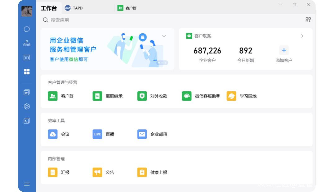 企業微信則介於兩者之間。企微得益於微信的天然背書,在通訊場景具備優勢,成為銷售、客服等與外部客户溝通頻繁崗位的首選工具。企業要玩私域流量的時候,也自然會用微信。