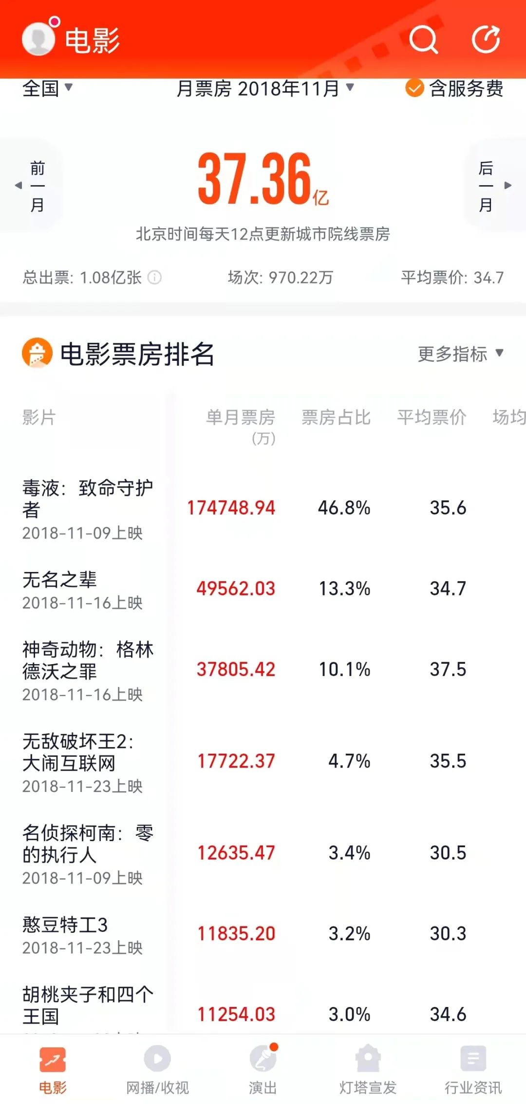 而從過去的經驗裏,不難發現解決這個問題的辦法:**超級爆款存在的同時,需要數量更多的、品質過硬的中小成本影片持續穩定地供給。**像在歷年11月裏票房表現最好的2018年,因為有“《毒液》+《無名之輩》”的組合,和另外5部票房過億的影片,才達到了37.36億的高票房。