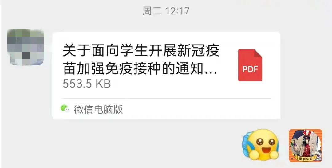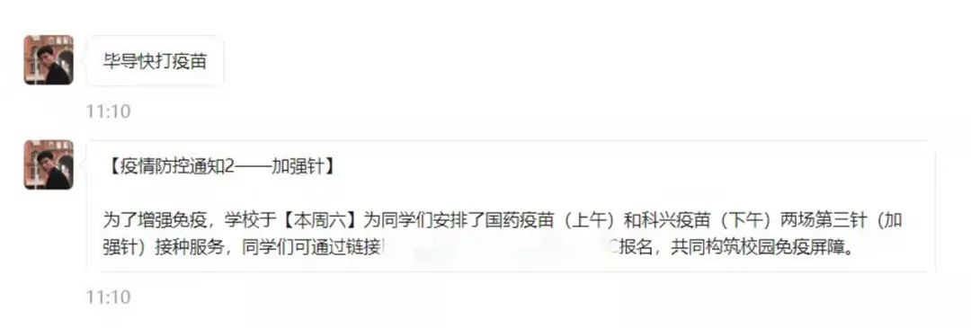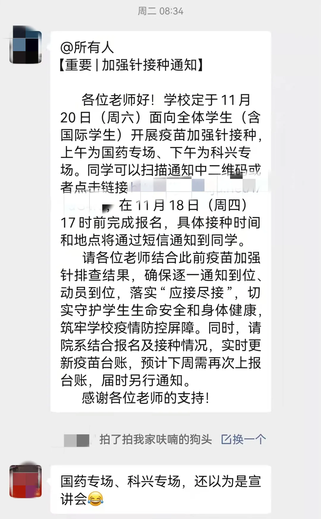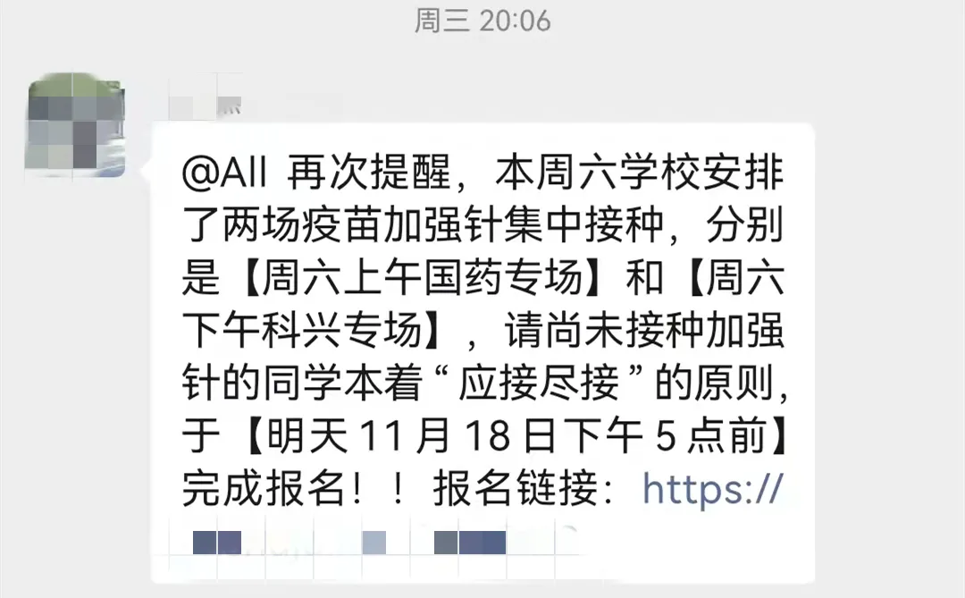 上期我們講到,學校通知全體同學打新冠疫苗第三針加強針。消息層層下發,最終我係通過各年級的微信羣通知到了每位同學,除了我。因為我們年級現在只剩下我1個人了,沒有羣,就沒有收到任何通知,疫苗也沒打上。