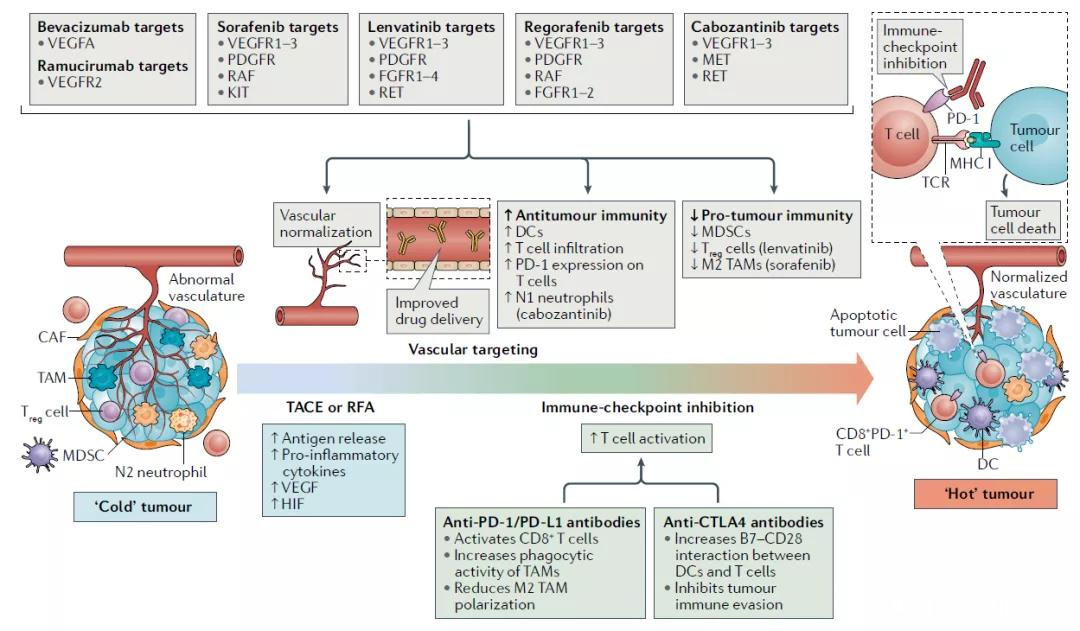 目前基於免疫檢查點抑制劑的組合療法包括與酪氨酸激酶抑制劑(TKI)聯用,或與抗VEGF抗體聯用。這些組合的一個共性是抑制VEGF信號通路。肝細胞癌的腫瘤血管網絡出現異常,抑制VEGF信號可以起到兩個主要作用:(1)削減血管增生,導致缺氧狀態;(2)血管結構的正常化,這可以改善藥物的遞送,以及潛在促進免疫細胞從血管中遷移到腫瘤組織中,更有效地進行免疫監控。