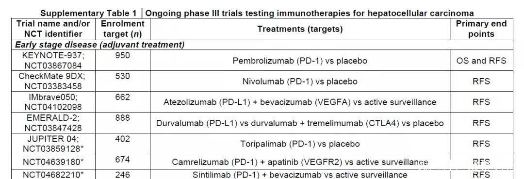 免疫療法治療早期肝癌的部分3期臨牀試驗(圖片來源:參考資料[1])