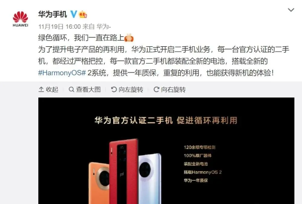 華為手機官方宣佈,為了提升電子產品的再利用,華為正式開啓二手機業務,每一台官方認證的二手機,都經過120餘項專項檢測,100%原廠器件,每一款官方二手機都裝配全新的電池,搭載全新的HarmonyOS 2系統,提供一年質保,重複的利用,也能獲得新機的體驗。