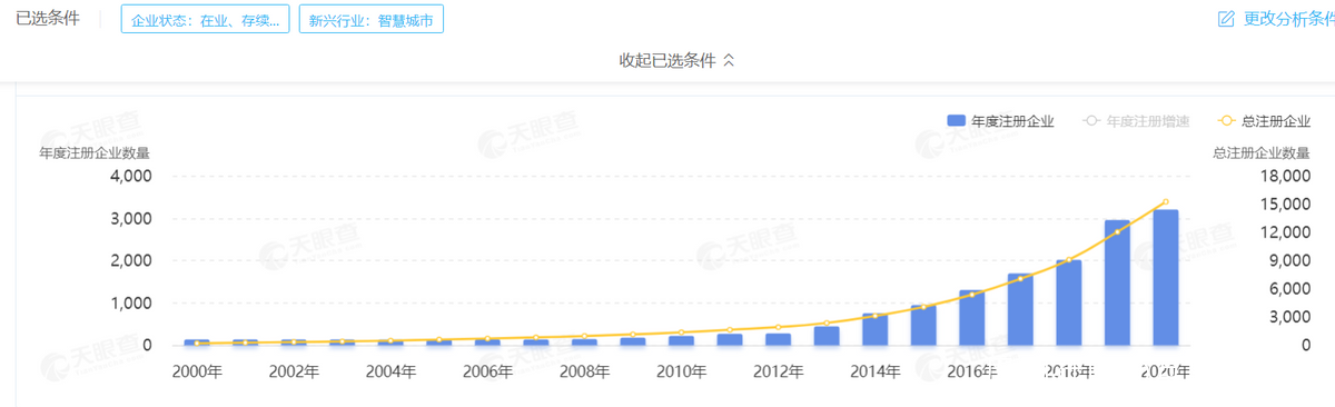 從2013年國家推出第一批智慧城市試點起,至今已有7年多,但是想要馴服這匹諸多高新科技組成的“技術野馬”依然十分艱難。如果説早期的智慧城市建設處於1.0階段,那麼如今我們正揭開智慧城市2.0的篇章。據天眼查專業版APP數據顯示,智慧城市行業的年度企業註冊數量在近兩年達到了一個新的高峯。