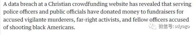 報道中稱:“一家基督教眾籌網站的數據泄露顯示,在職警官和公職人員向被指控的私刑謀殺者、極右翼活動人士以及被指控槍殺黑人的籌款人募捐。”