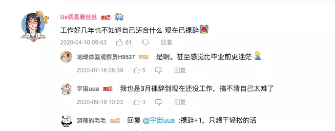 隨着00後開始進入職場,“前輩們”開始不自覺感覺到惶恐,“內卷”、“996福報”、“三胎”、“離婚冷靜期”,生活的壓力不斷加重,工作多年依舊沒有職業規劃的人比比皆是,這就不難看出帶有“裸辭”標籤的視頻會持續在網上火起來,無論屏幕那邊是否離職,在職的打工人都會下意識點進去,尋求一點虛幻的快樂。