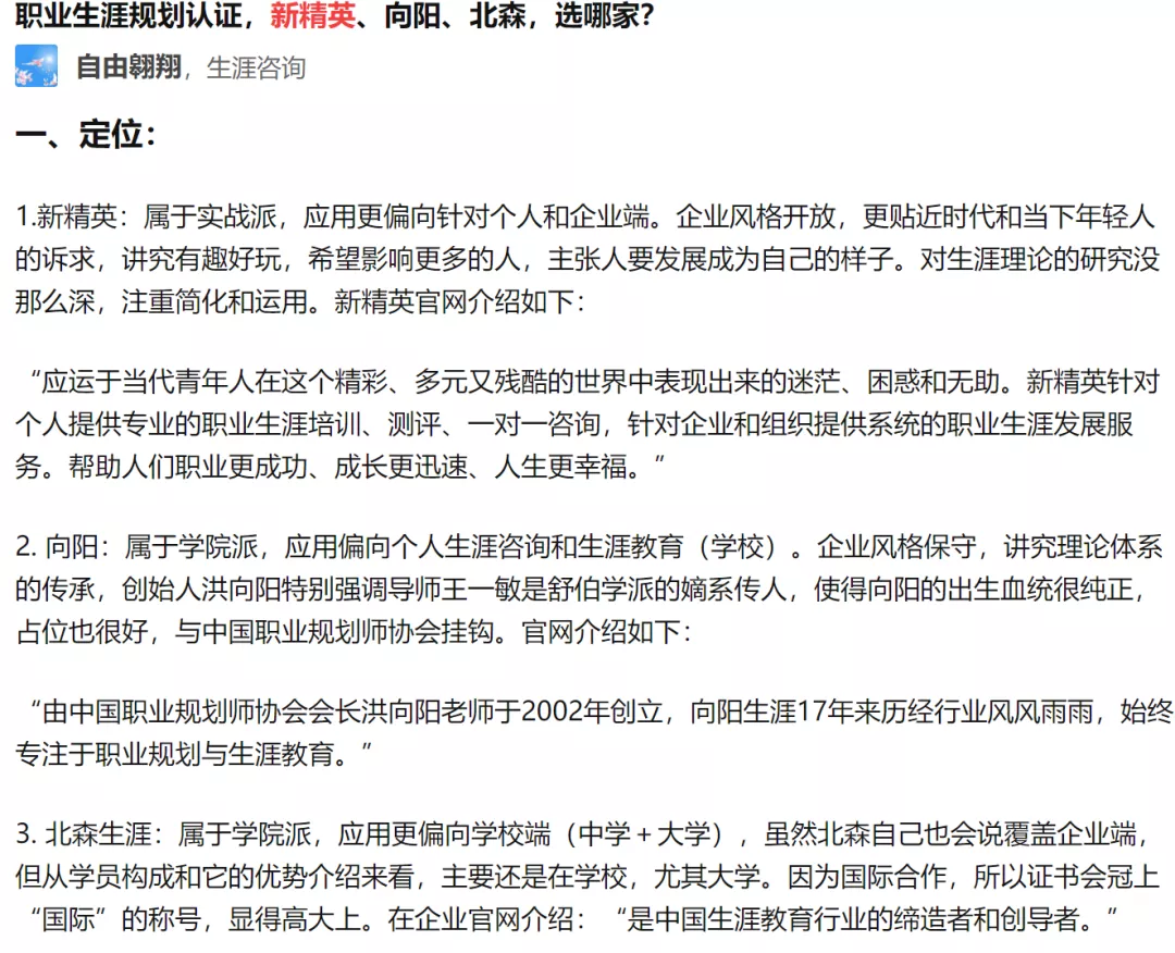 新精英、向陽、北森等職業規劃培訓機構就在搜索引擎、社交網絡、問答社區投放了大量推廣,並提供了一定的數據佐證“職業規劃”的作用。例如三巨頭之一的“北森生涯”就在其官網首頁聲稱“2020年擁有雙證(生涯規劃師專業能力培訓證書、新職業產業聯盟頒發的認證證書),26%副業收入超過主業”“服務2000萬人實現晉升”。