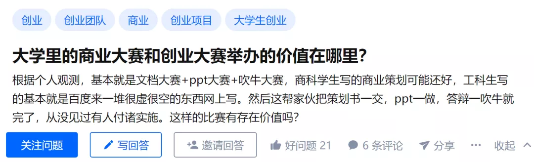 ——這似乎是老師們也有意無意認可的結果。知乎用户王鎮雷就根據自己的經歷認為“創業大賽”的本質其實就是“創業計劃大賽”,強調的是“規劃”,絕大部分參賽作品可能都是利用老師或者前輩的科研半成品來進行包裝和加工,提出的創意或者專利未必是自己團隊的,學生們最能獲得參與感更多的是會在老師和同學的幫助下,所還原的流程化辦公、壓力面試。