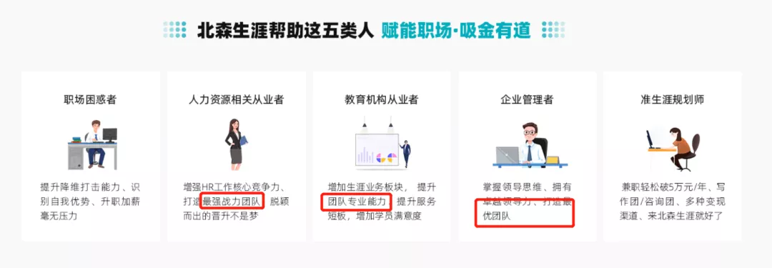 這些機構服務的羣體也非常有針對性。除了處於擇業階段的應屆畢業生等“職場困惑者”,HR、企業管理者、教育機構從業者也被認為是最適合進行“生涯規劃培訓”的羣體,並且擁有一個相同的學習目標:打造優秀團隊。