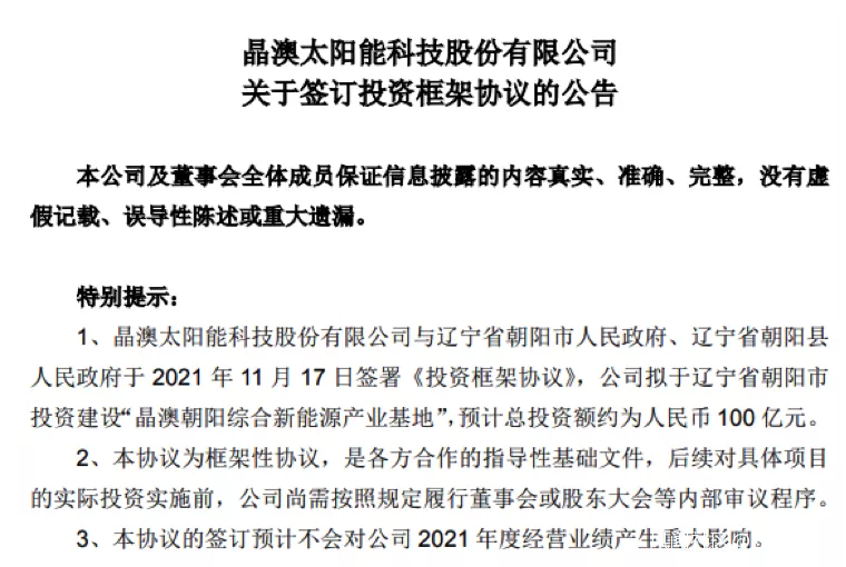 公司與遼寧省朝陽市人民政府、遼寧省朝陽縣人民政府簽署《投資框架協議》,公司擬投資約100億元在遼寧省朝陽市投資建設“晶澳朝陽綜合新能源產業基地”。