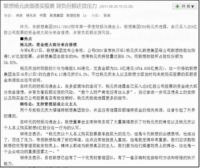 倒是柳某在數年後的一次訪談裏,把楊某當年舉債31.5億港元來購買聯想股票的事情,以很自豪的口吻説了出來。