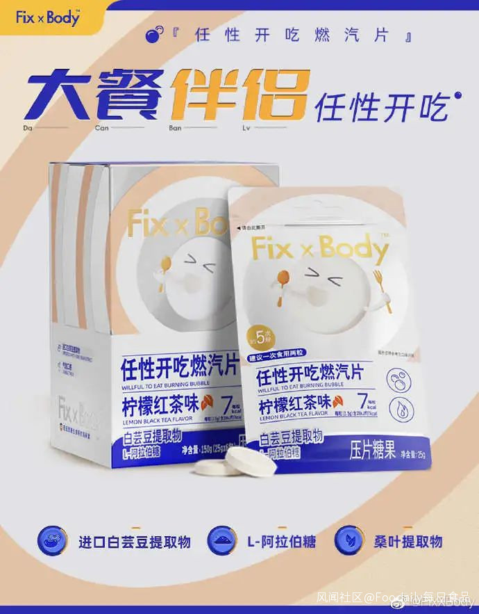 11月10日,旺旺旗下Fix X Body宣佈推出新品檸檬紅茶口味任性開吃燃汽片,定位於大餐伴侶,旨在讓消費者輕享美食無負擔。新品添加兩大核心成分:每100g含白芸豆提取物12000mg,可阻斷66%澱粉吸收;添加3% L-阿拉伯糖作甜味劑,能通過抑制腸道蔗糖酶的活性,降低餐後血糖水平,且不會被人體吸收,甜蜜無負擔;此外還添加0.5%天然桑葉提取物。燃汽片每袋10粒裝,天貓售價25g/包/29.9元。