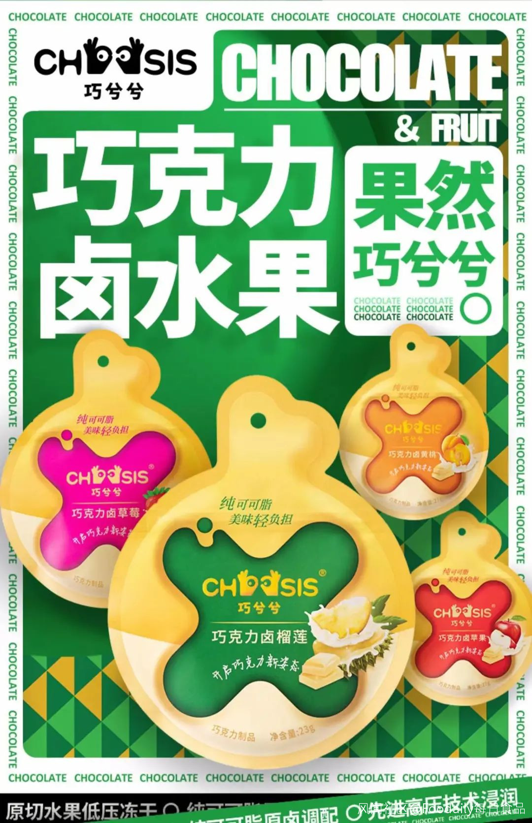 11月12日,巧兮兮在其微信公眾號推出巧克力滷水果系列產品。新品首創巧克力分子滷工藝,將全球進口的純可可脂經過高壓技術浸潤凍幹水果微小的纖維組織,不破壞水果原有的外形口味與巧克力進行完美交融,帶來獨特的味蕾體驗。新品共有榴蓮、草莓、黃桃、蘋果、芒果和菠蘿6種口味,現已上線天貓巧兮兮旗艦店,巧克力滷榴蓮售價23g/袋/19.8元,其他5中口味產品售價27g/袋/19.8元。