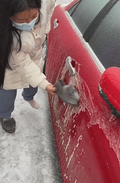 下凍雨,車門凍上了咋整?拿鞋把冰敲下來唄。