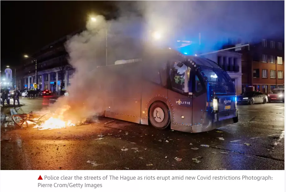 而**荷蘭繼19日週五反防疫遊行引發騷亂後,20日週六在海牙再度發生暴力示威,**造成5名警察受傷,至少40人被捕。