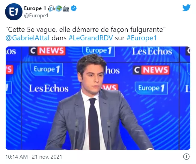 11月21日,法國政府發言人阿塔爾在歐洲一台新聞台表示:“第五波疫情正以閃電速度蔓延。”