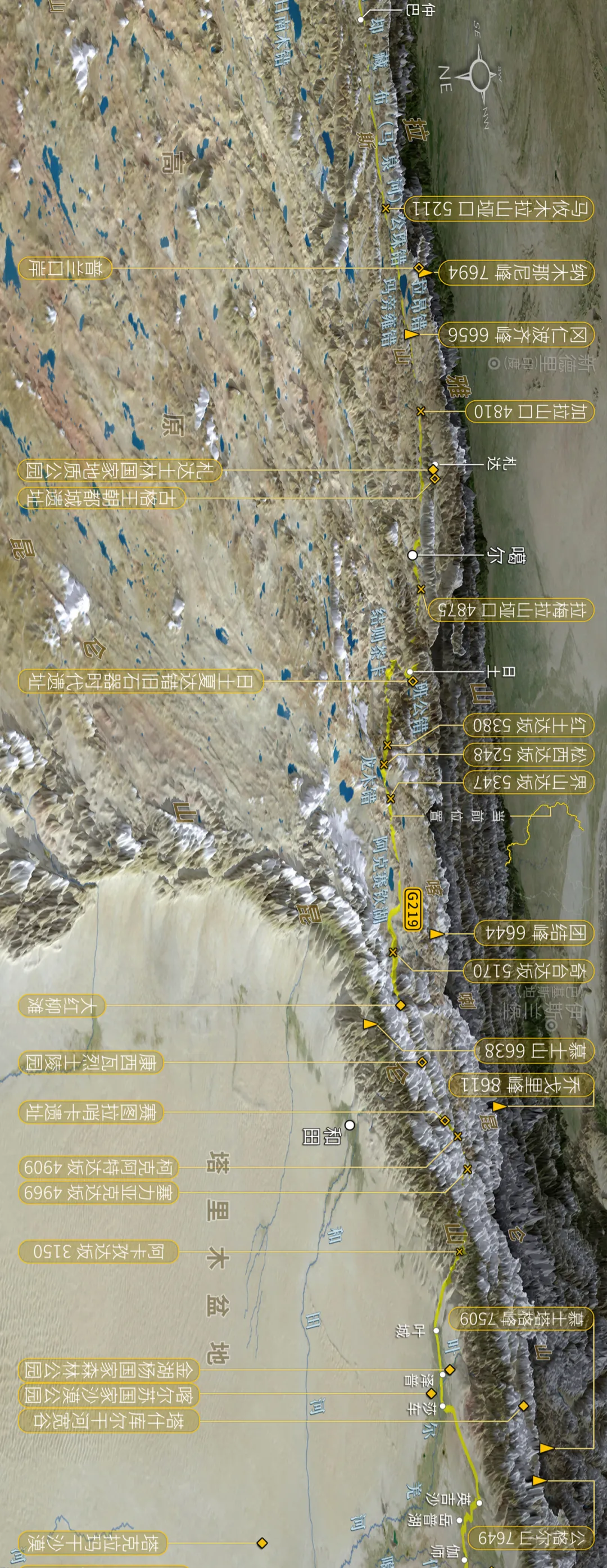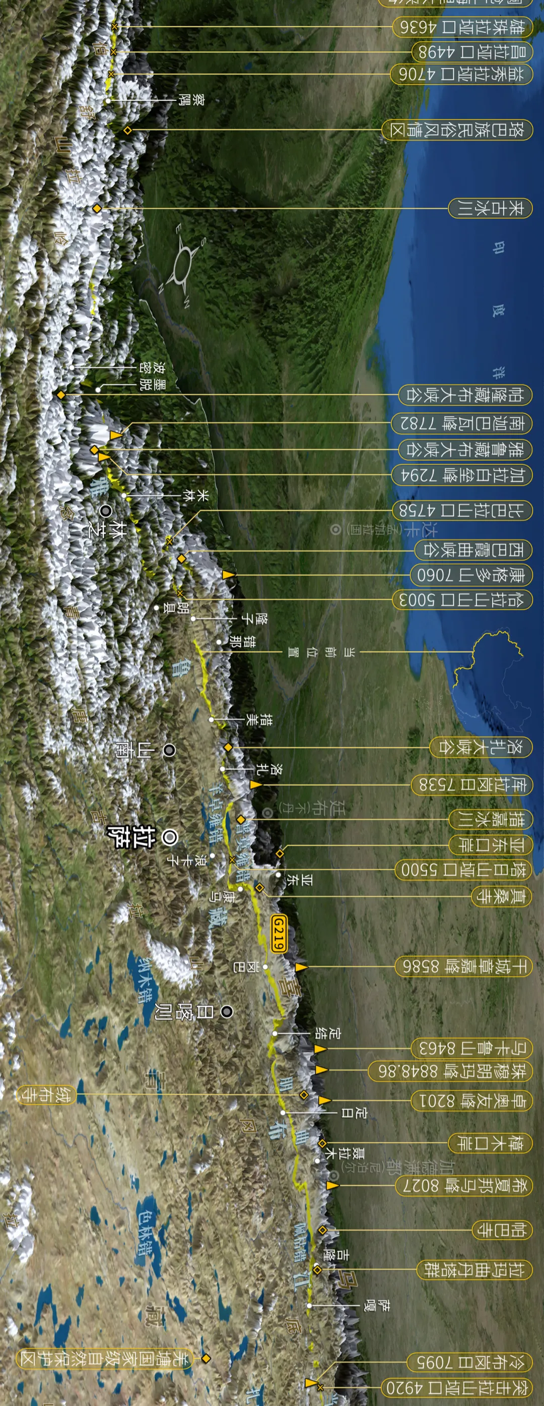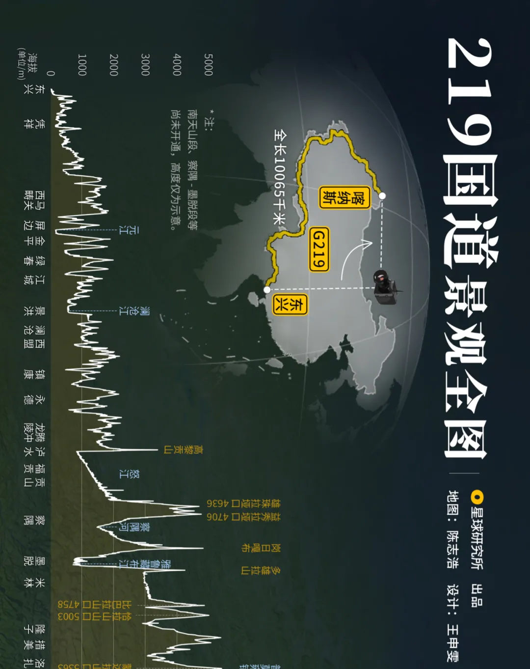 (請橫屏觀看,219國道超長景觀全圖;為了能在手機固定寬幅內,完整不中斷地展示呈弧形的219國道,我們決定用特殊方法將其“拉直”,讓大家一覽到底,製圖@陳志浩&王申雯/星球研究所)