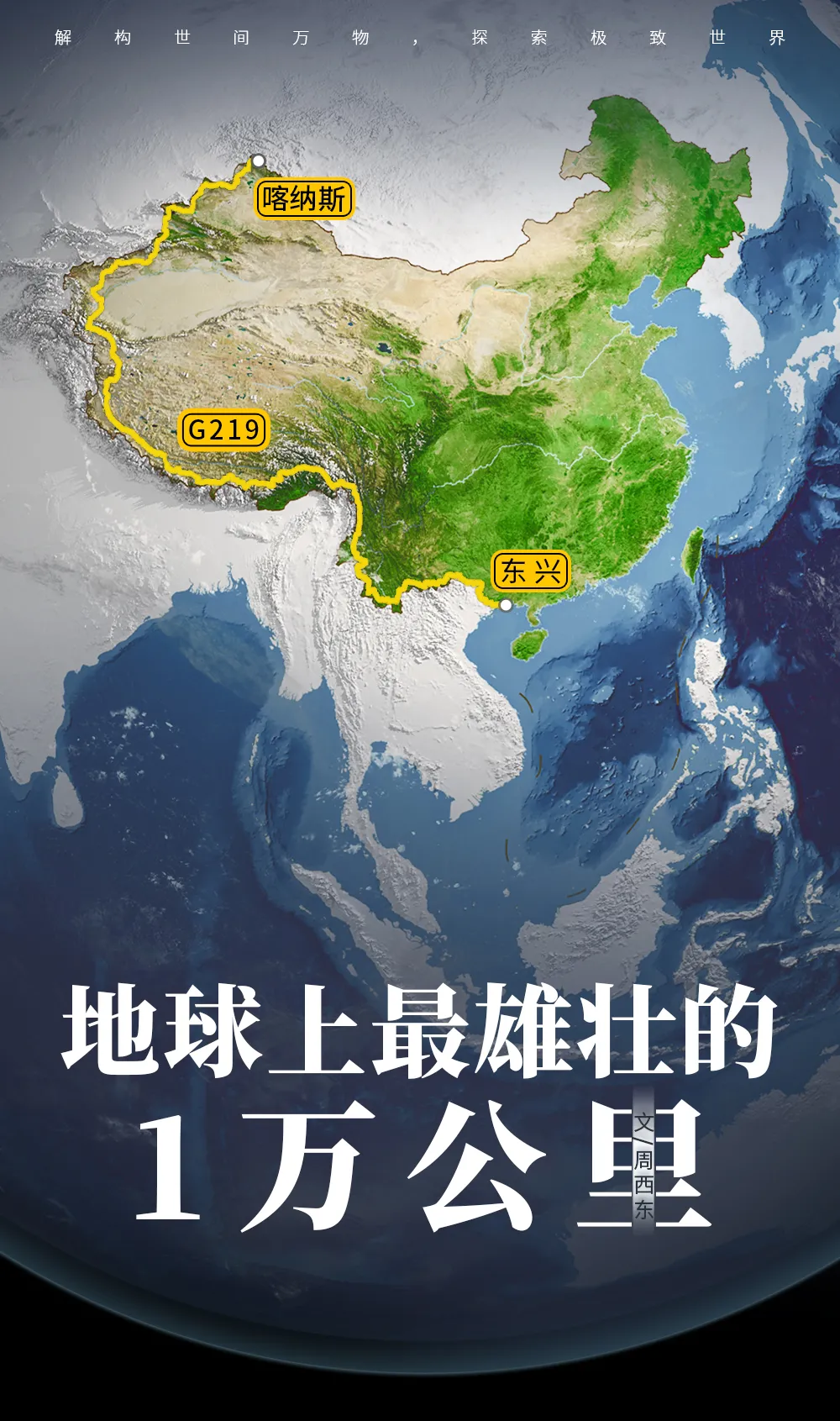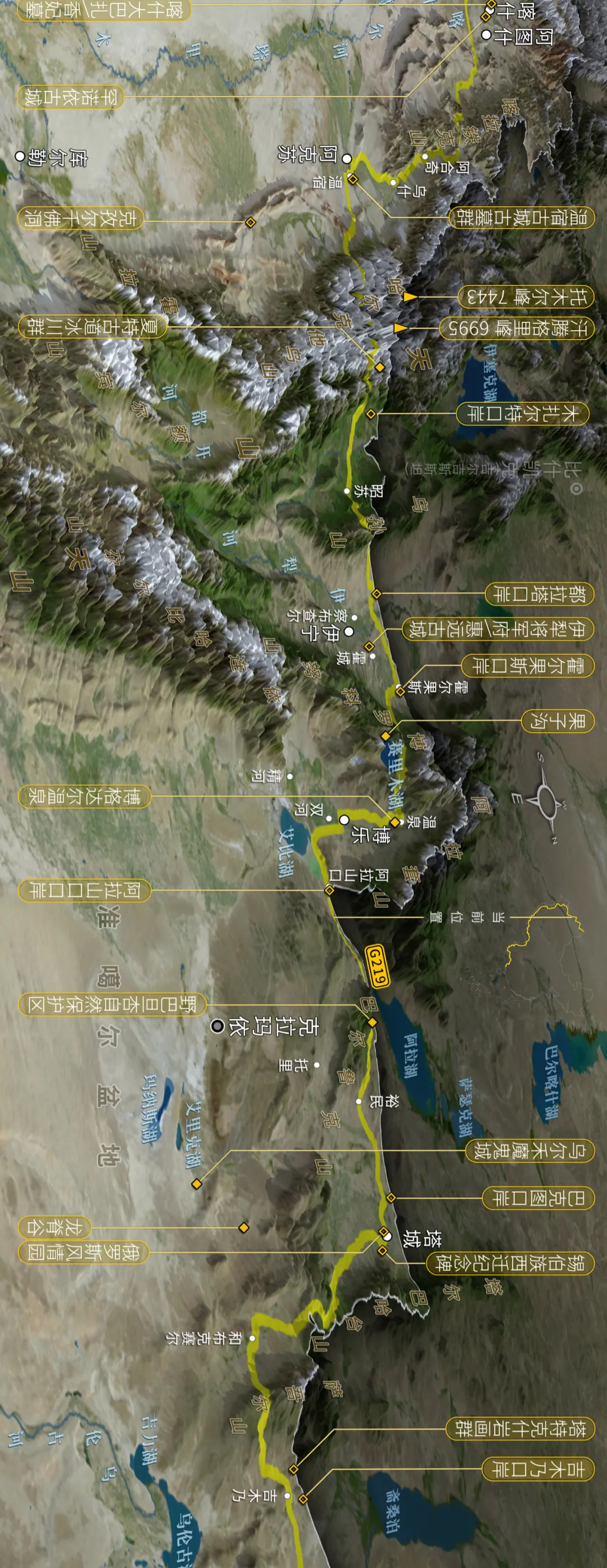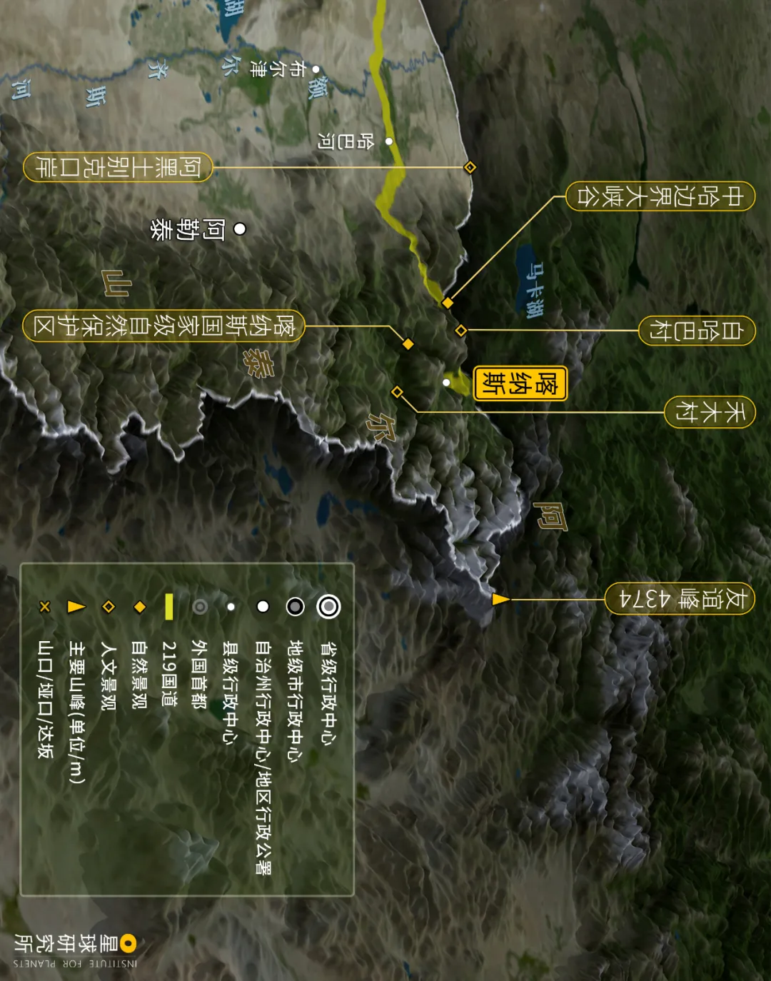 (請橫屏觀看,219國道超長景觀全圖;為了能在手機固定寬幅內,完整不中斷地展示呈弧形的219國道,我們決定用特殊方法將其“拉直”,讓大家一覽到底,製圖@陳志浩&王申雯/星球研究所)