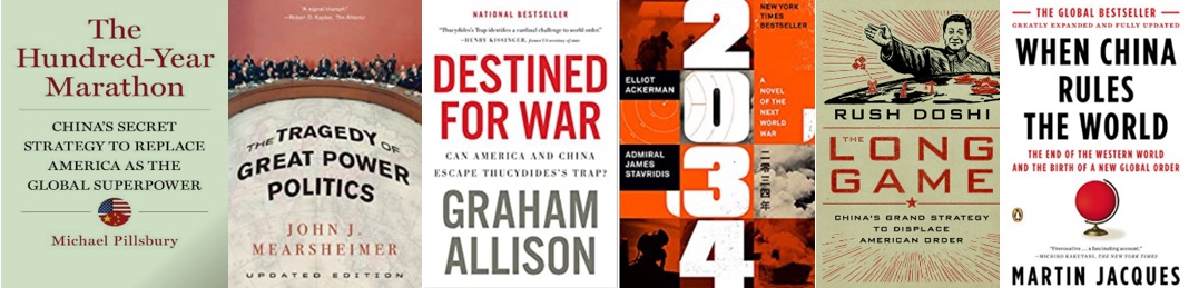 由於近年中國的實力迅速變得逼近了美國,“中國威脅論”就開始在美國越來越流行了。這兩年本人看了好多本都是近年美國人寫的有關中美關係的英文原著,比如Mearsheimer的《大國政治的悲劇》(The Tragedy of Great Power Politics, 2014),Graham Allison的《註定一戰》(Destined For War, 2018),描寫中美十來年後大戰的小説《2034》(2021),RushDoshi的《長期博弈》(The Long Game, 2021),….. 總之,這類論調慢慢地就成為主流了。而相反的,主張中美友好的著作就很少見了。倒是還有一本捧殺中國的英國人 Martin Jacques寫的《當中國統治世界》(When China Rules the World, 2010)。