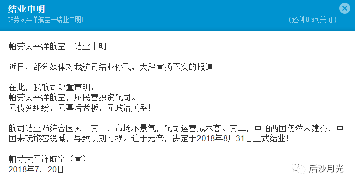 帕勞太平洋航空公司2018年7月只好宣佈停止對華業務,中文版的結業申明寫得很悲涼。