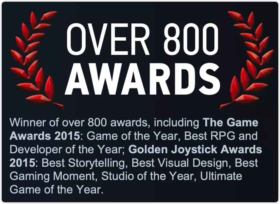 後來的故事大家都知道了,《巫師3》拿下了大大小小超過800個獎項,在遊戲史上刻下了鑲金的名字。