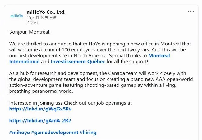 11月11日,米哈遊發佈最新公告,終於印證了多方猜測。公告顯示,米哈遊將在蒙特利爾設立新工作室,預計未來兩年內招聘100名員工,並以此為起點進軍北美市場。