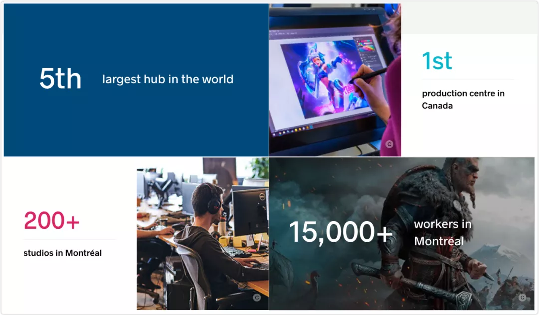 得益於政府支持,電子遊戲相關產業的優惠政策使得蒙特利爾的遊戲開發成本大大降低。隨着產業聚集效應不斷擴大,魁北克省周邊人才都被蒙特利爾所吸引,促使特效、動畫、音效等關聯行業蓬勃發展,互為後盾。